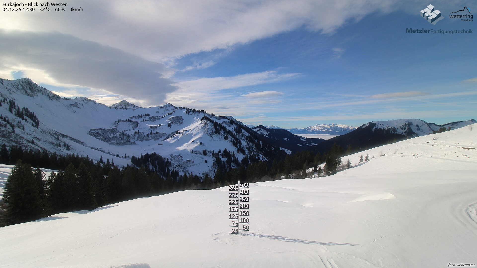 Im Verlauf des Abends setzt von Süden her (Montafon) Schneefall ein. Die Schneefallgrenze sinkt inneralpin bis in die Tallagen (600m). Im Walgau und Rheintal und Vorderen Bregenzerwald liegt sie hingegen bei 700-900m. In den Bergregionen fallen zwischen 3-8 cm Neuschnee bis Freitagmittag.