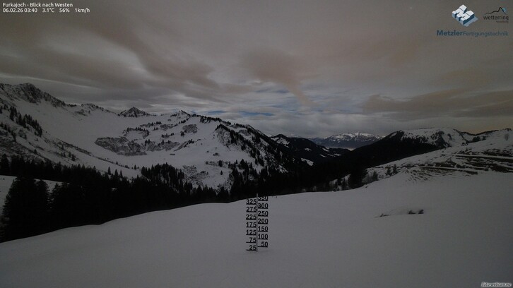 Vorwarnung: Am späten Vormittag bzw. gegen Mittag aufkommende Niederschläge. Die Schneefallgrenze liegt um 1100-1300 Meter. Ab dem Mittelgebirge fallen bis Samstagfrüh zwischen 2-8 cm Neuschnee. Am meisten davon im Gebiet Hochtannberg-Arlberg.