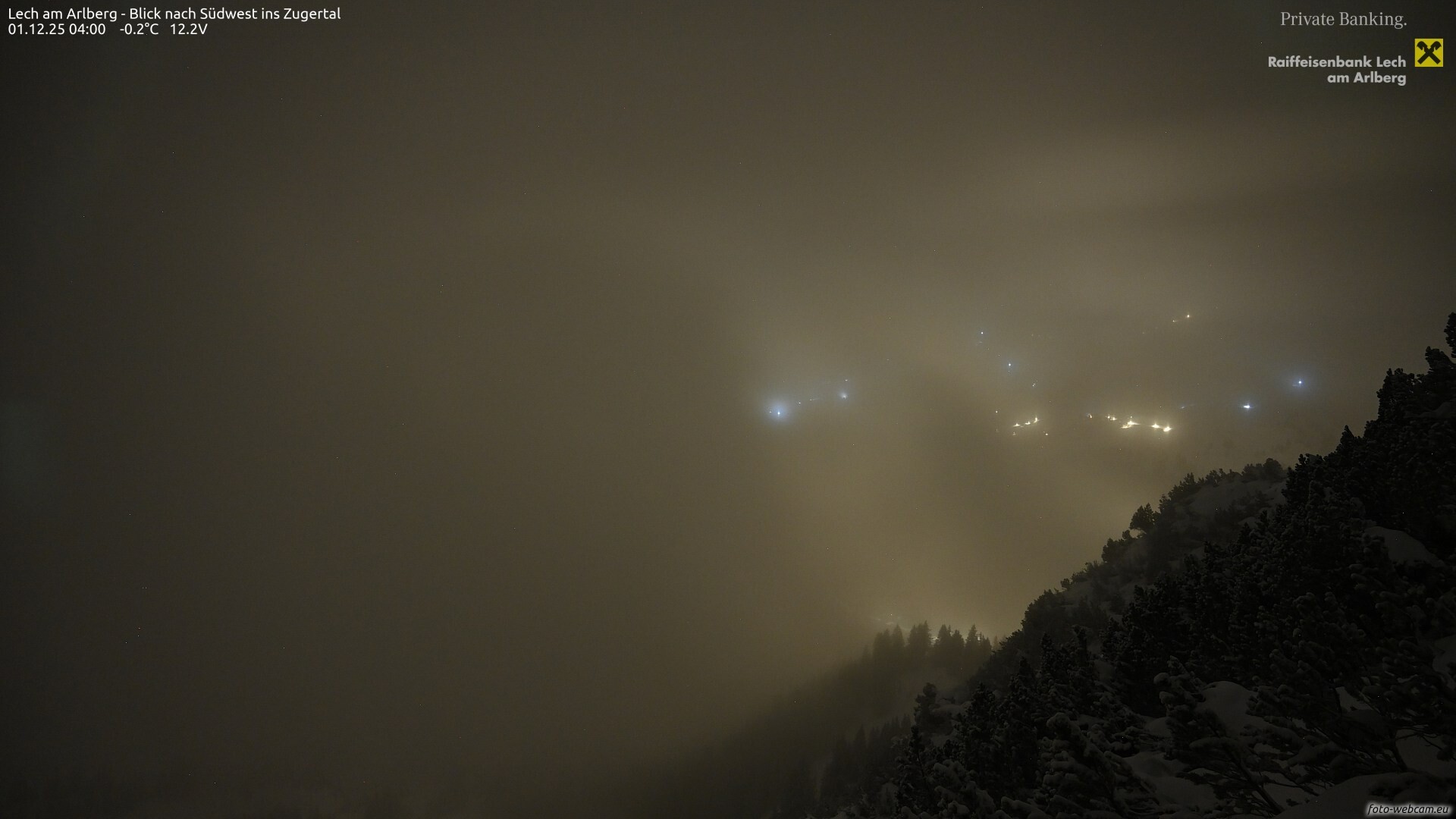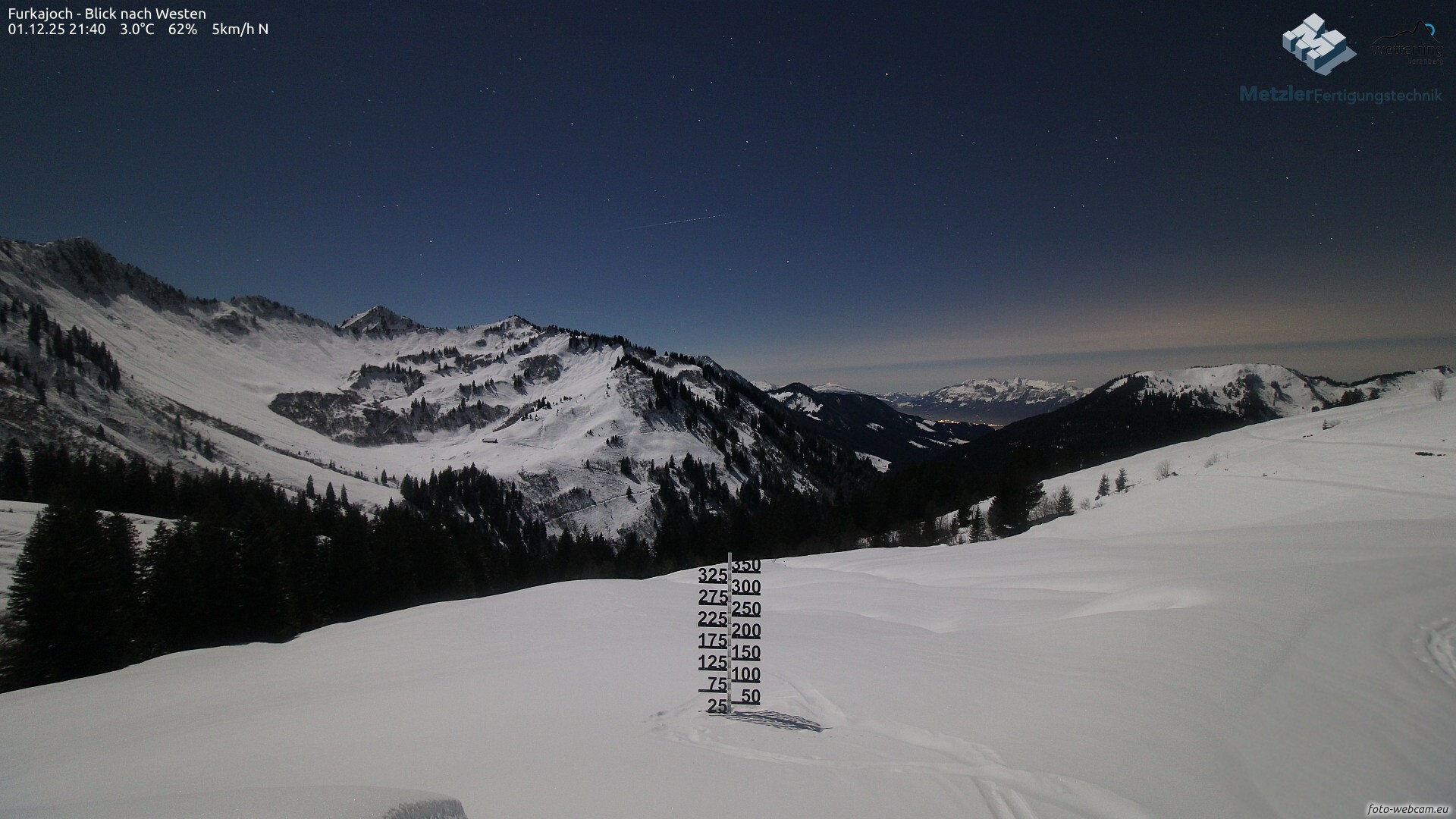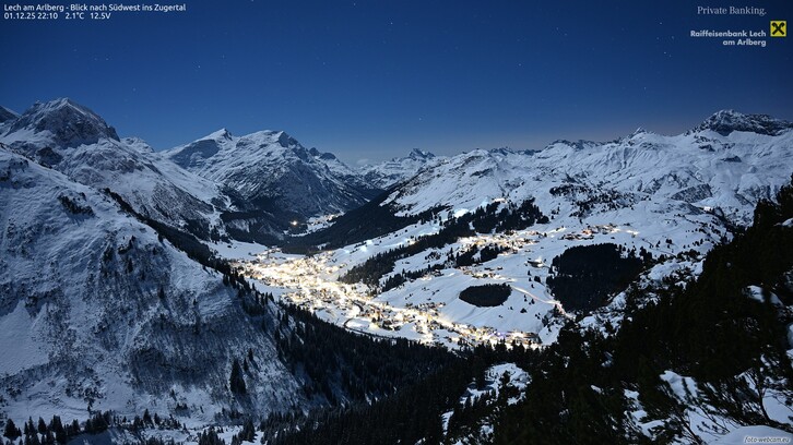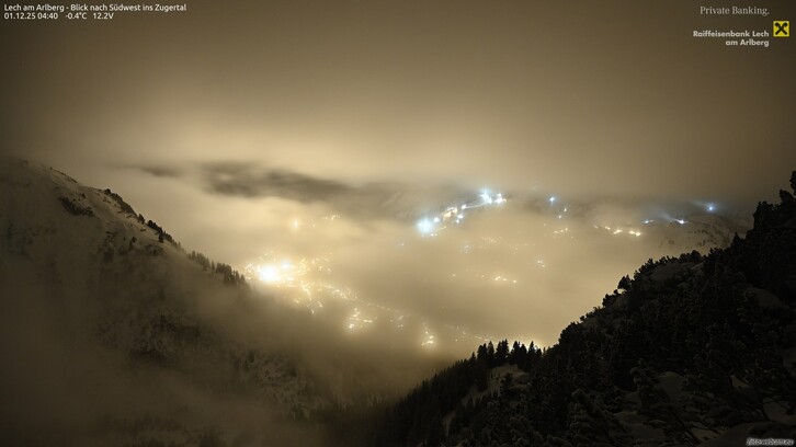 Im Verlauf des Abends trifft eine schwache Kaltfront ein. Diese bringt über Nacht etwas Niederschlag, wobei die Schneefallgrenze von 1300 auf etwa 800 Meter absinkt. Mehr als 2-5 cm Neuschnee kommen aber auch in den höheren Gebirgslagen nicht zusammen.